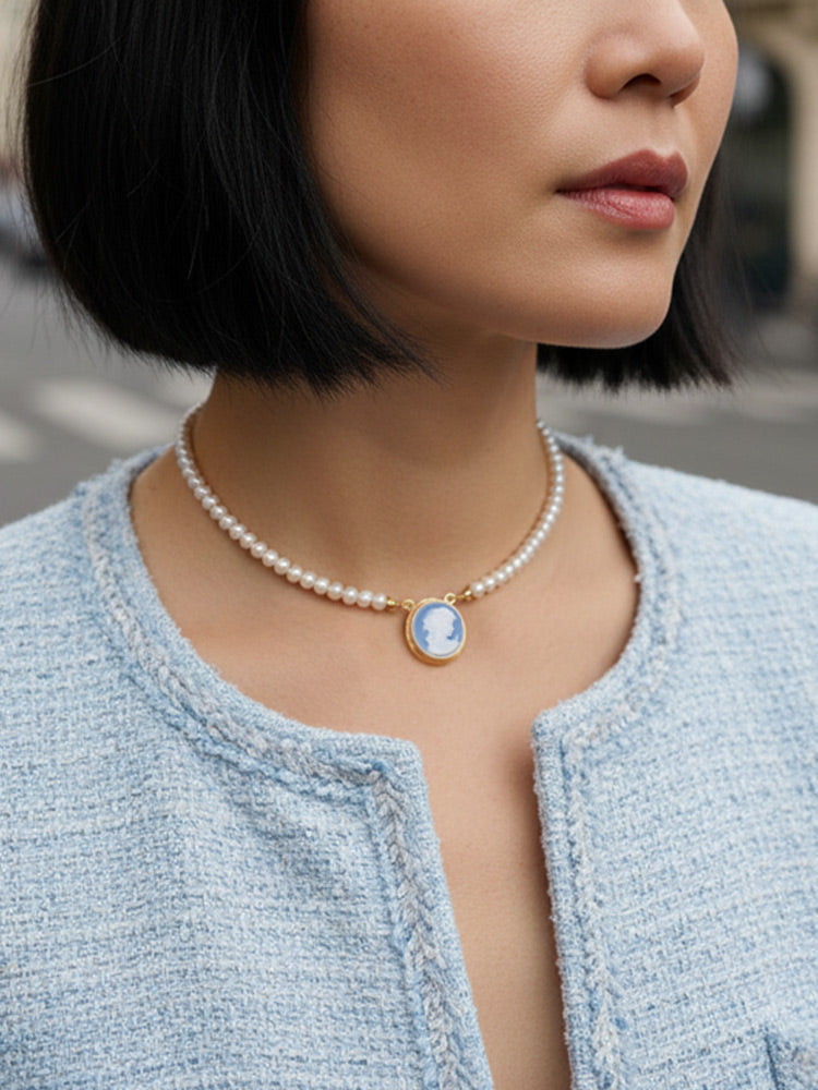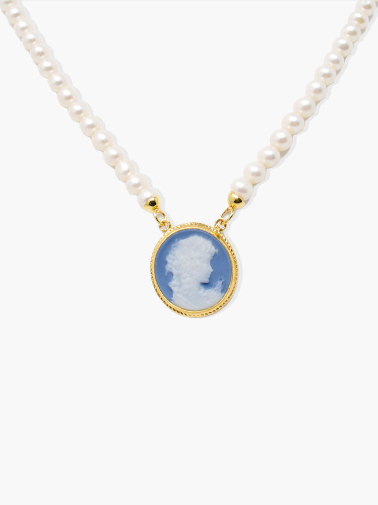 The cameo is crafted in blue porcelain and set in 18k gold-plated sterling silver with a protective palladium layer. It forms the pendant of a freshwater pearl necklace, where the softness of natural pearls meets the clarity of the carved profile. Each piece is handmade in our atelier in Italy by skilled artisans using traditional cameo carving techniques.