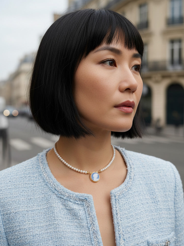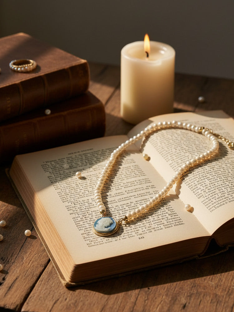 The Antoinette Cameo Necklace With Pearls features a hand-carved porcelain cameo depicting the profile of a woman — a subject historically associated with femininity, identity and quiet strength. Inspired by the iconic aesthetic of Marie Antoinette, the design recalls an idea of refined beauty, elegance and individuality shaped through detail.
