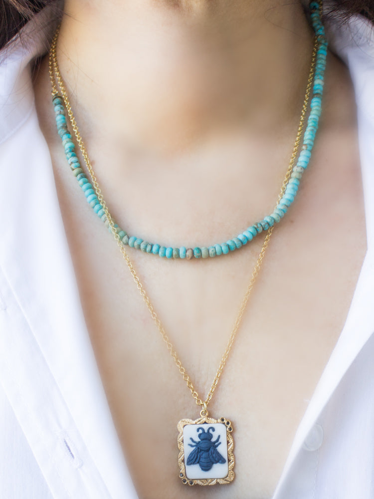 This Bee cameo necklace is carefully hand-carved from fine white porcelain and it symbolizes good luck and industriousness. It's inspired by Egyptian mythology in which bees were considered sacred animals. The Bee cameo necklace is handset in 18k gold over sterling silver, layered with a handmade turquoise beaded chain.