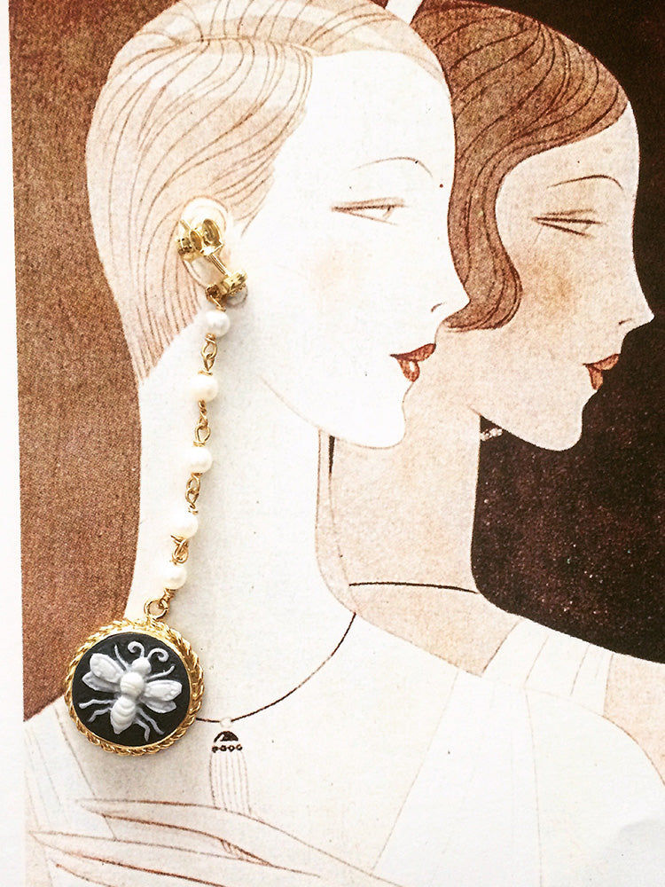 Get inspired with these beautiful Bee Cameo Earrings, featuring dangling pearls and intricately hand-carved Bee cameos. A symbol of staying focused and finding the sweetness in life, these earrings are hand-set in 18-karat gold-plated silver and accented with a sparkling AAA grade black zircon. Give the gift of meaning and style with these iconic earrings, perfect for birthdays or graduations.