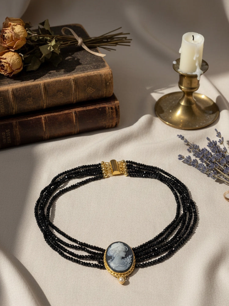 Inspired by the refined elegance of classical portrait cameos, our Iris Cameo Choker With Black Tourmaline is a bold expression of femininity and contrast.