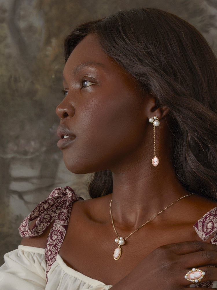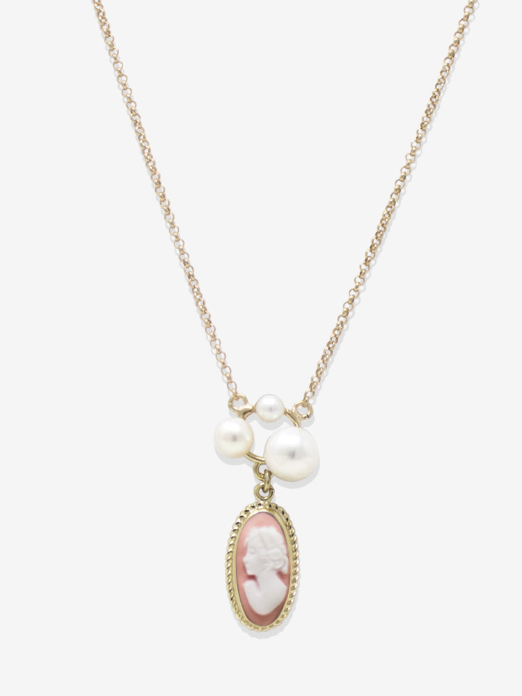 Our Lilith necklace is crafted with care, featuring hand-carved porcelain cameos and mismatched freshwater pearls in 18-karat gold-plated silver. Add a touch of elegance to any outfit with this sustainable and unique piece.