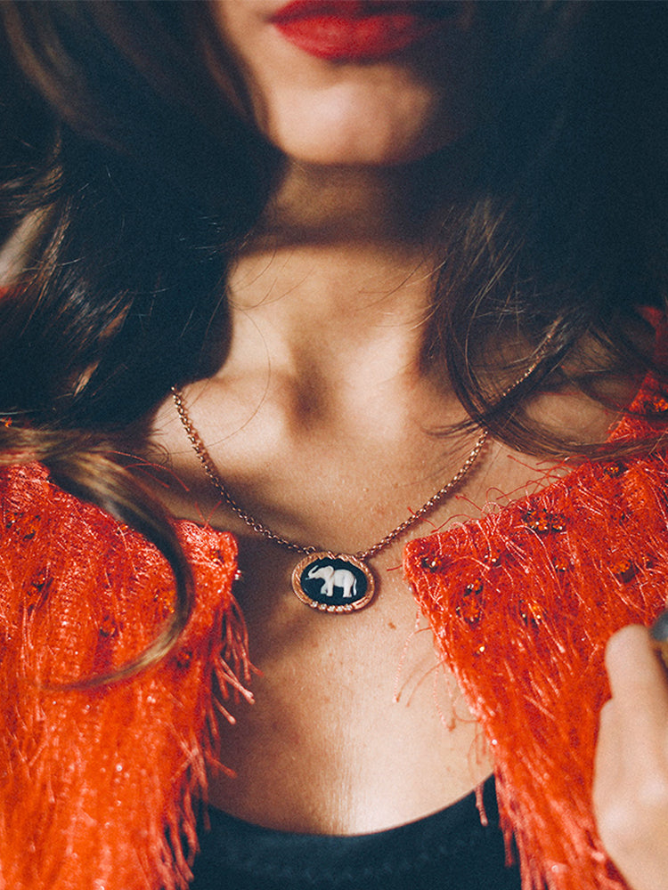 The Elephant Cameo necklace is inspired by the worldwide belief that this adorable, wise and strong animal is a powerful symbol of good luck and wisdom. It is composed of a hand-carved fine porcelain Elephant cameo bezel-set in a hand-engraved 18k rose gold plated silver frame, embellished with sparkling white crystals adding a touch of liveliness to the piece.