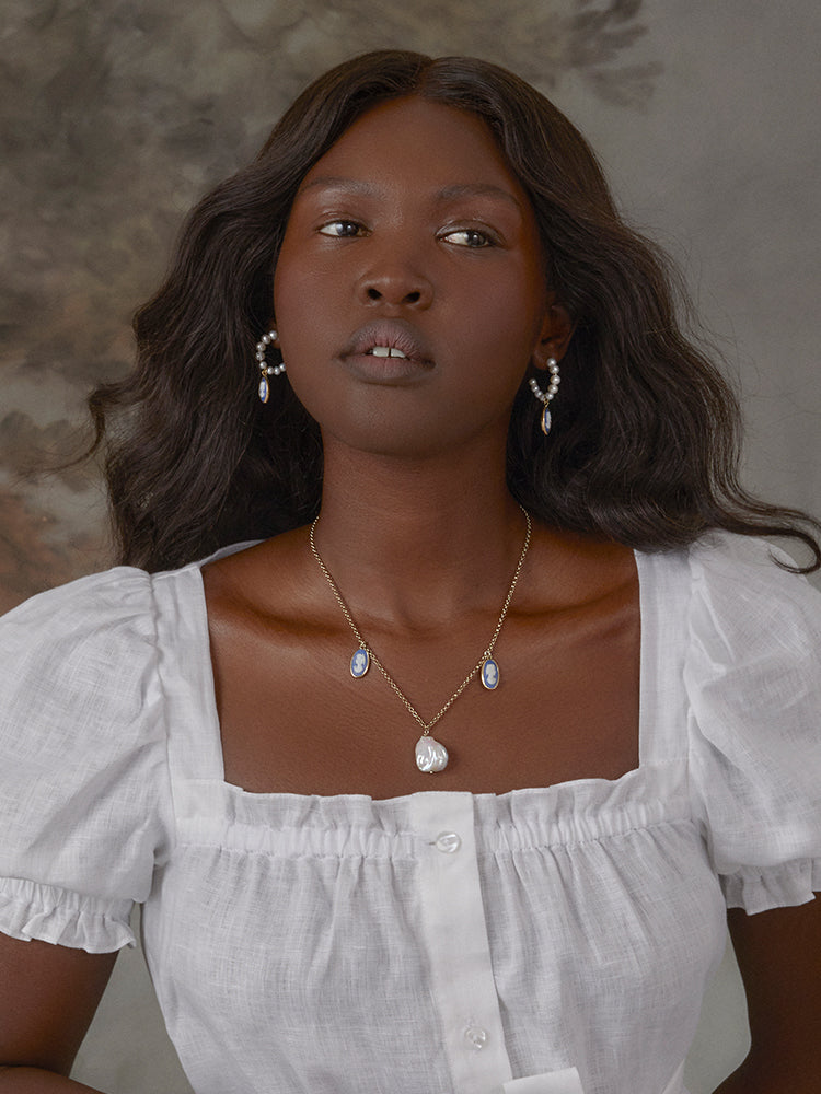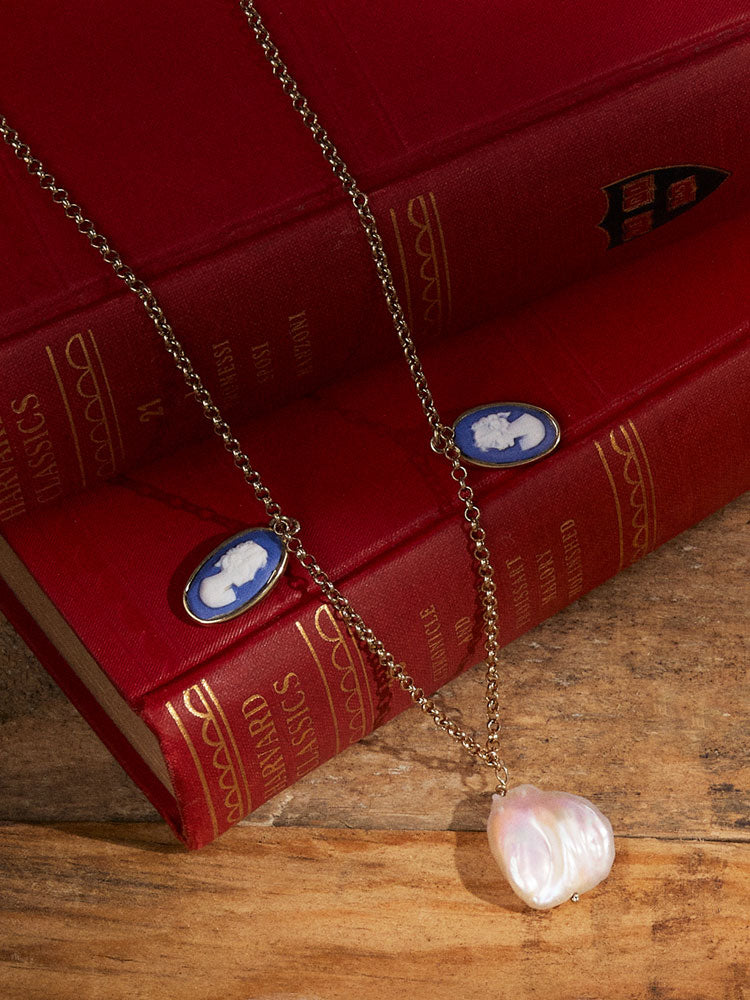 We aim to create jewelry for those who love to own something unique. Our Medea necklace is handmade from 18-karat gold-plated recycled silver and features two hand-carved porcelain cameos enriched with a lustrous baroque pearl that gently hangs. Layer yours over a cashmere sweater or strapless top.