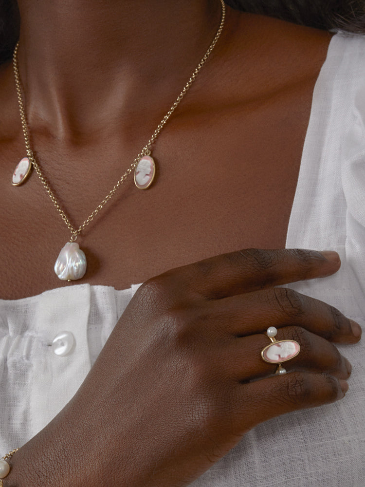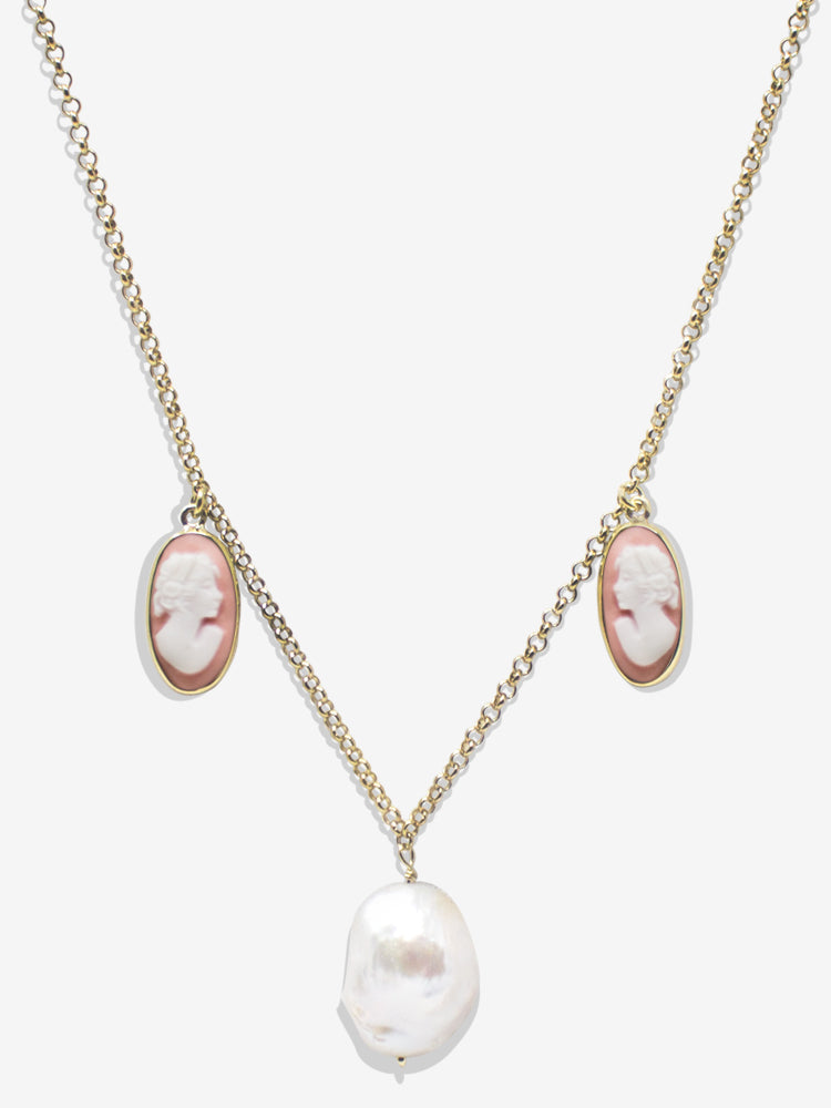 We aim to create jewelry for those who love to own something unique. Our Medea necklace is handmade from 18-karat gold-plated recycled silver and features two hand-carved porcelain cameos enriched with a lustrous baroque pearl that gently hangs. Layer yours over a cashmere sweater or strapless top.