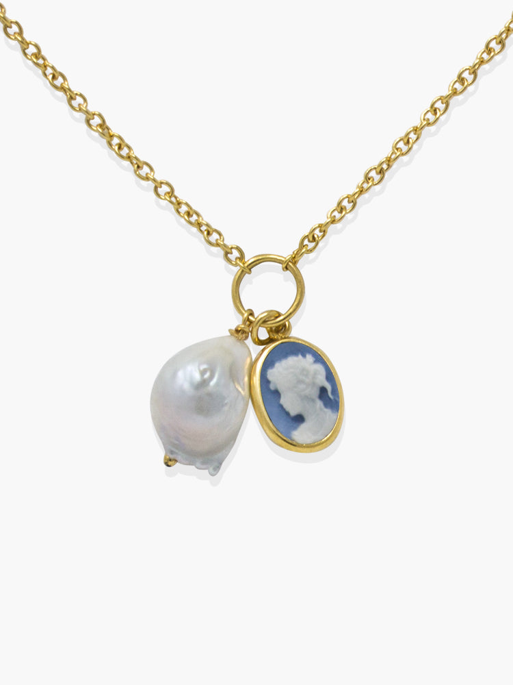 This elegant and understated sky blue mini cameo necklace is handmade from porcelain and paired with a lustrous pearl. The cameo is handset in gold-plated silver, adding a touch of sophistication. Perfect for any occasion, this necklace is guaranteed to elevate your style.