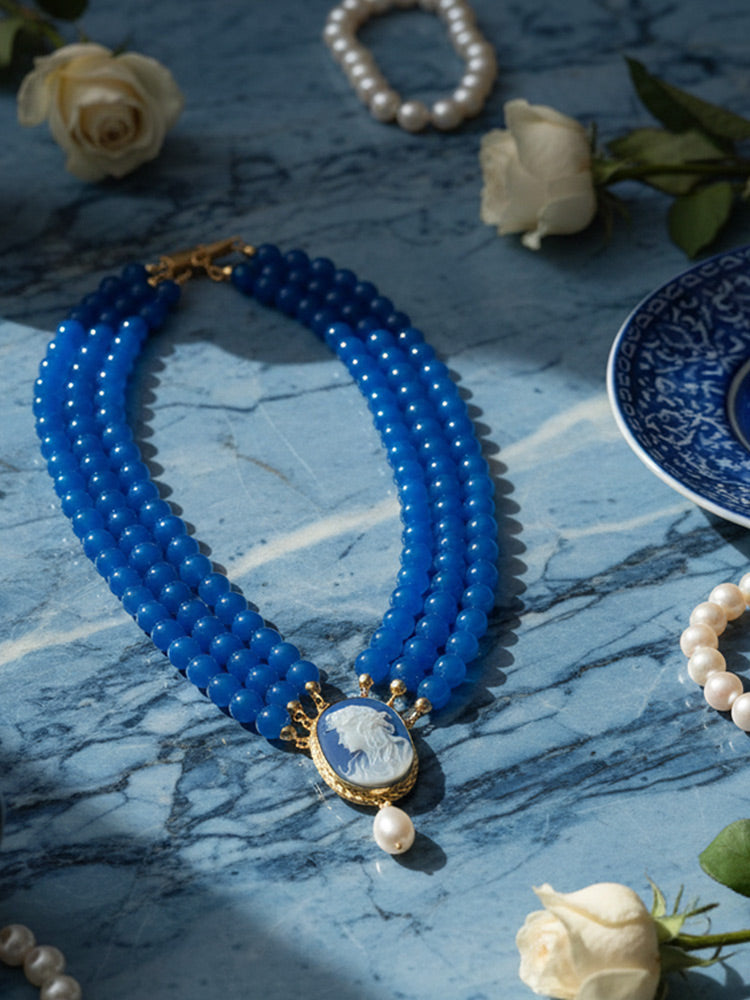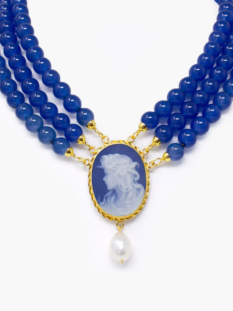The cameo is carefully set in gold-plated sterling silver and handcrafted in Italy by skilled artisans, preserving the heritage of traditional cameo carving while embracing modern design sensibilities. Three strands of natural blue agate beads frame the pendant, adding richness and depth to the composition. Blue agate, associated with balance and calm, enhances the necklace’s sophisticated presence while creating a bold statement effect.
