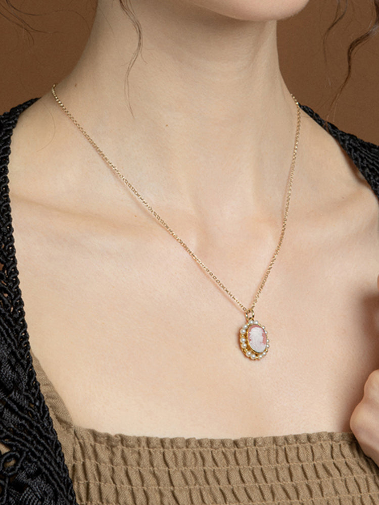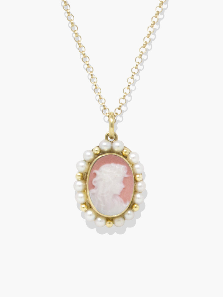 This delicate 'Little Lovelies' necklace is cast from 18-karat gold-plated silver and strung with a beautiful hand-carved from porcelain pink cameo masterfully wrapped in a row of freshwater pearls that adds an absolute classy touch to the piece. Style comfortably yours everyday.
