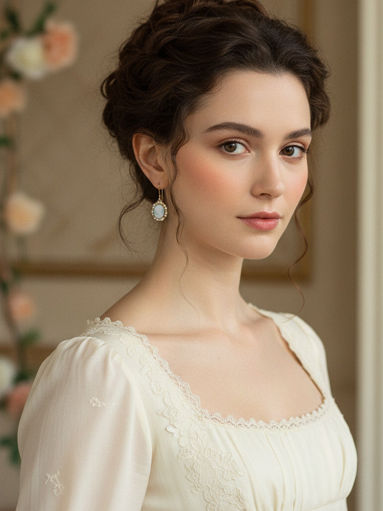 Evoke the lush elegance of an English garden with our Green Cameo and Pearl Earrings, a refined addition to our collection as seen on Bridgerton. These hand-carved porcelain cameos, featuring a delicate sage-green hue, are a tribute to the prestigious artisanal heritage of Torre del Greco.