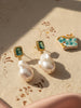 Each earring features vibrant green quartz stones paired with lustrous baroque pearls, suspended from gold-plated silver for an elegant and fluid silhouette. The contrast between the vivid green quartz and the organic shape of the pearls creates a distinctive, sophisticated design.