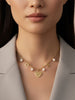 Crafted in sterling silver plated in 18k gold, the necklace features an ornamental heart adorned with intricate swirling motifs inspired by classical Italian craftsmanship. Along the chain, stylized heart elements and natural freshwater pearls create rhythm and softness, adding luminosity and grace to the design.