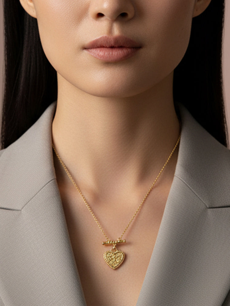 Crafted in sterling silver plated in 18k gold, the design features a sculpted heart enriched with intricate swirling motifs inspired by classical Italian craftsmanship. Suspended from a decorative bar detail, the heart becomes the focal point of the piece, celebrating balance, harmony, and devotion.