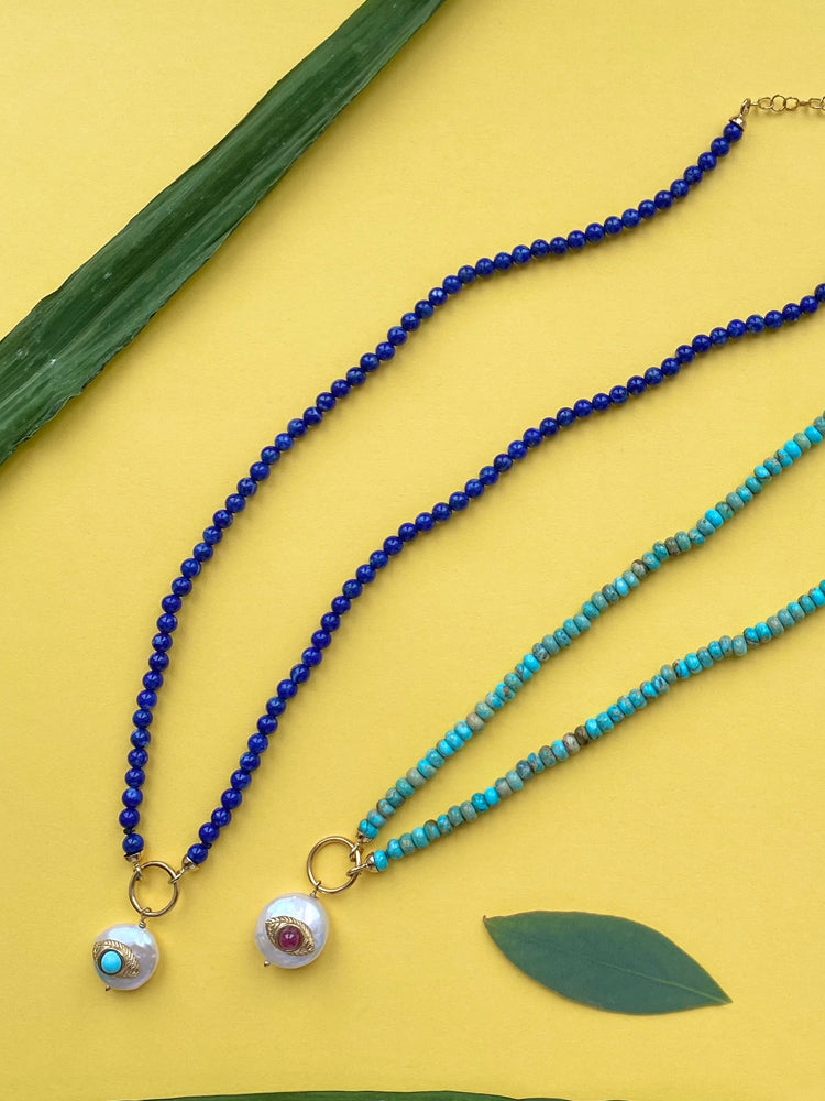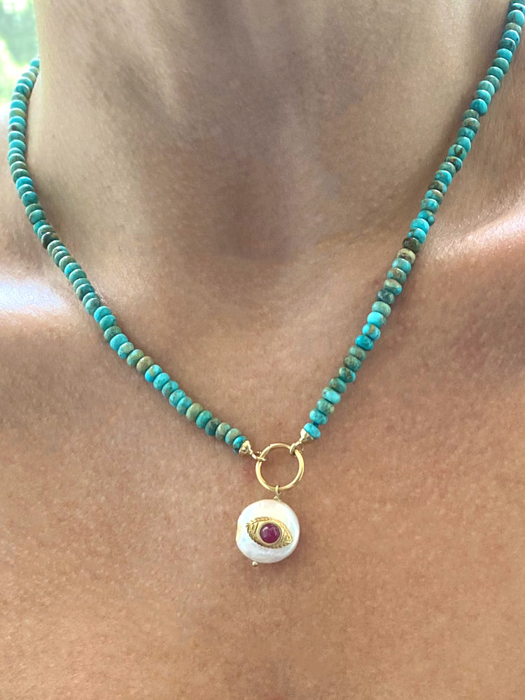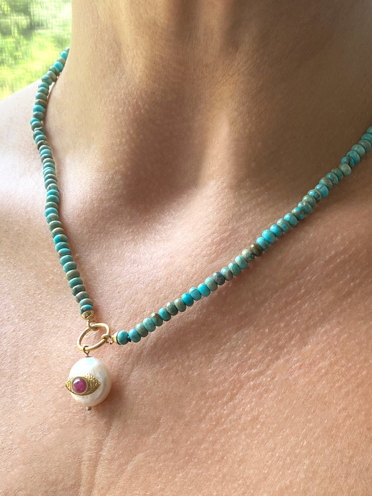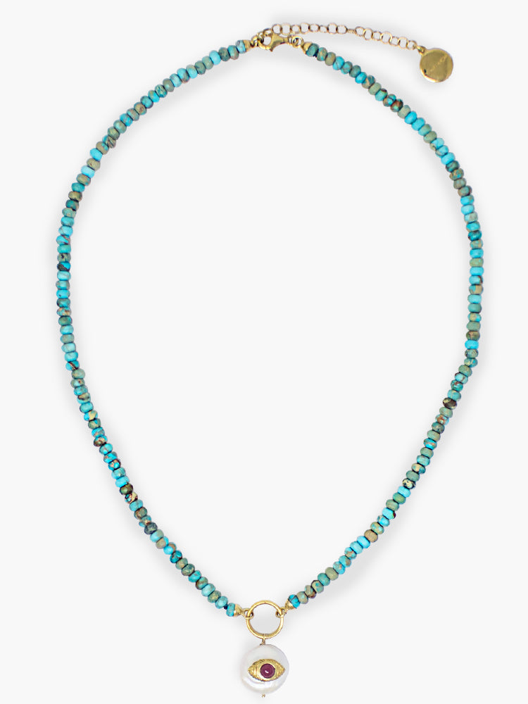 Protect your style with this handmade Evil Eye Necklace in tiny turquoise beads. The striking rhodolite eye and pearl accent make this piece a unique addition to any outfit. Made in Italy, it's a statement piece with a touch of charm.