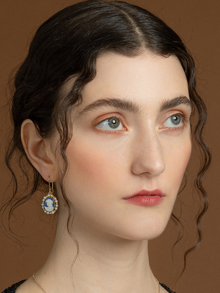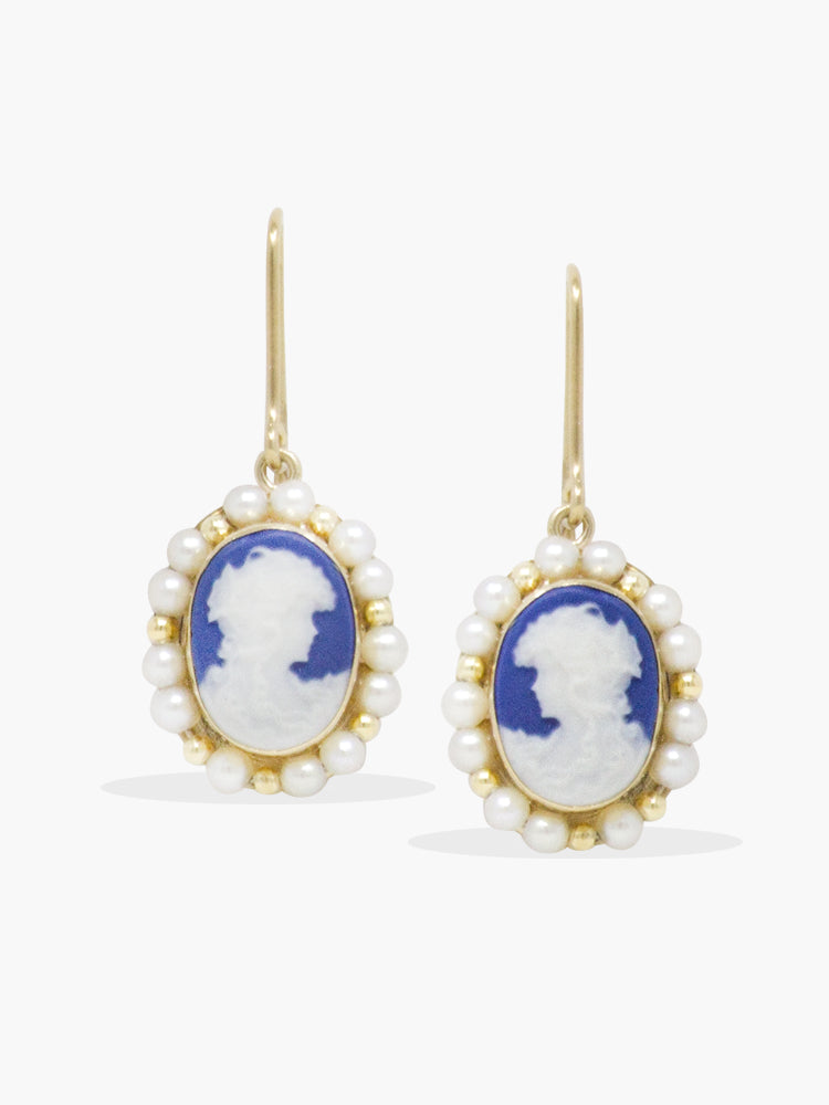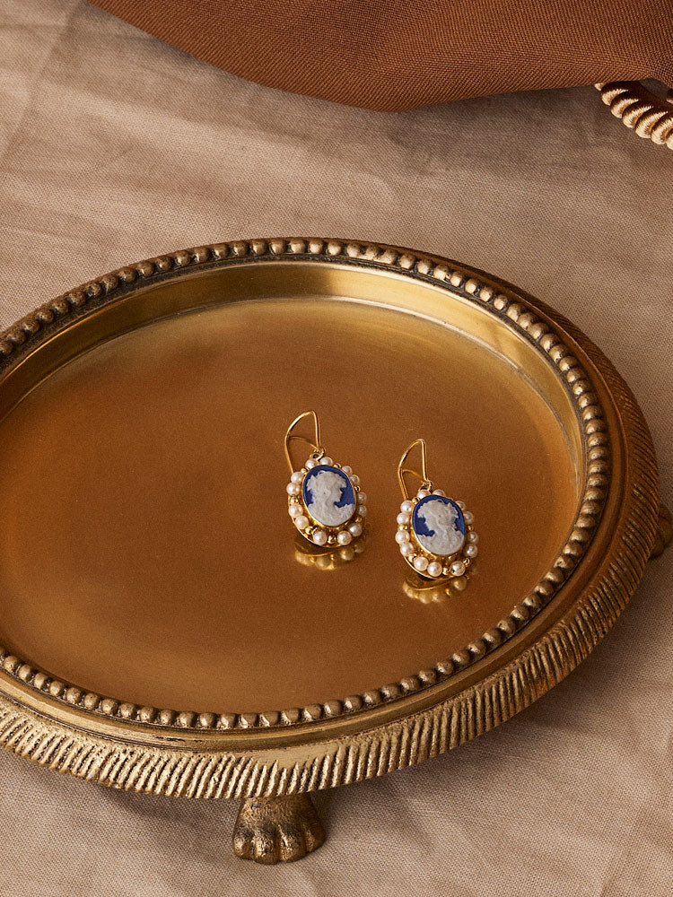 Our founder Alessandro Ricevuto's passion for cameo jewelry was sparked by the frenetic activity of goldsmiths and carvers in his father's workshops where he secretly rummaged in every corner. Handcrafted in the brand's studio in Torre del Greco, Italy, these 18-karat gold-plated earrings feature carefully hand-carved from porcelain blue cameos and lustrous mini freshwater pearls. Wear yours with the coordinating necklace and ring.