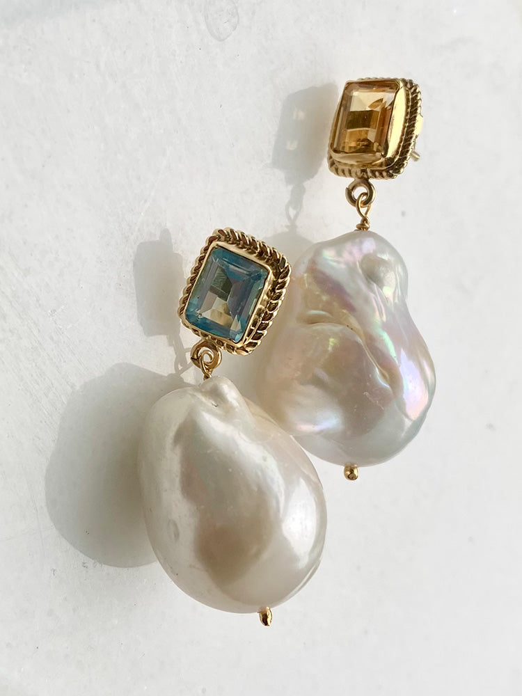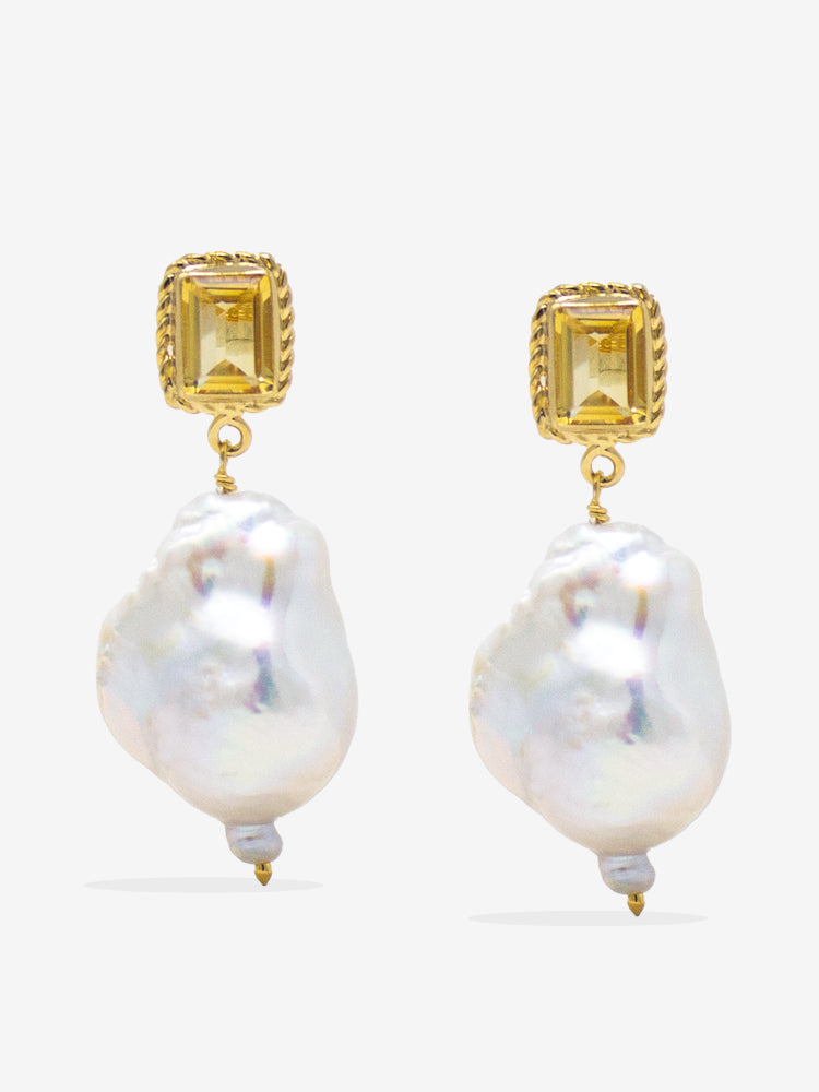Illuminate your look with our Luccichio Citrine And Baroque Pearl Earrings. The natural yellow citrine gemstones and lustrous baroque pearls add elegance to any outfit. Handcrafted in our workshops in Italy using traditional setting technique, these bold earrings are a must-have for any jewelry collection, available either in gold-plated silver or solid 10-karat gold.