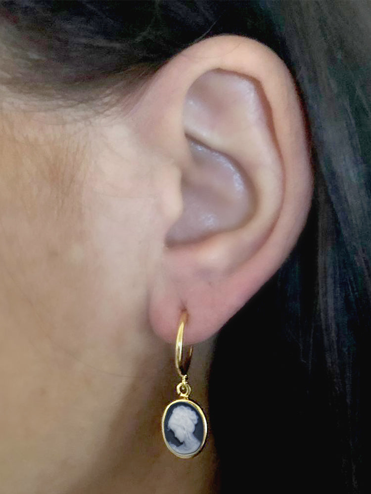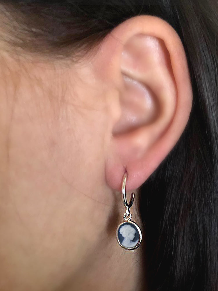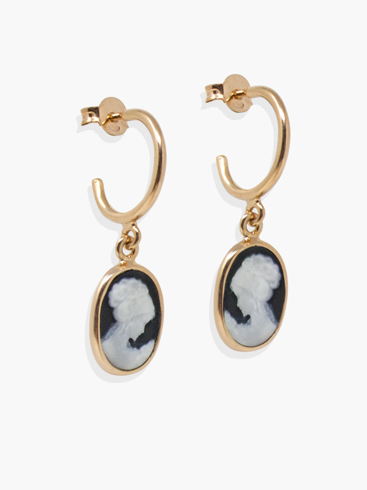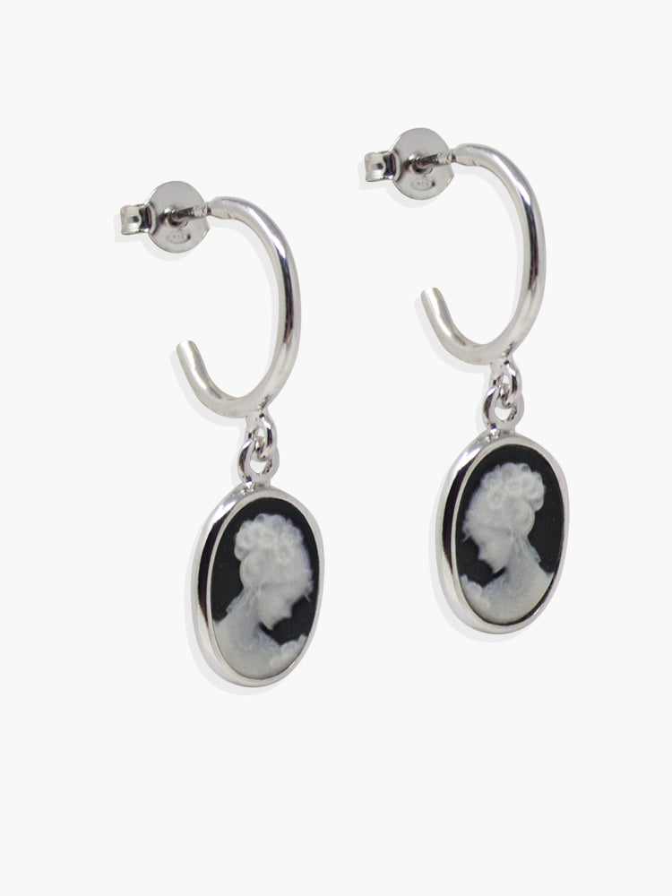 Handcrafted in Italy, these mini hoop earrings feature handcarved porcelain cameos in a classic black color. Made from recycled silver, these earrings are not only stylish but also environmentally friendly. Add a touch of elegance to any outfit with these timeless earrings.