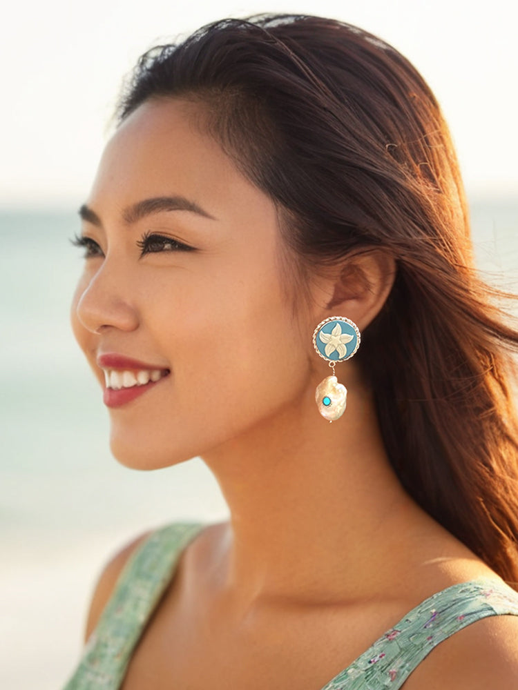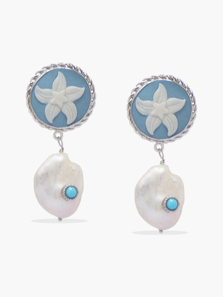 These Starfish Cameo Earrings with pearls and turquoise feature hand-carved porcelain cameos set in gold vermeil. The starfish motif symbolizes regeneration and resilience, reflecting renewal and healing. Enriched with lustrous baroque pearls and turquoise accents, these earrings are crafted sustainably using innovative techniques, honoring the antique tradition of cameo jewelry while offering a timeless accessory that encourages strength and balance.