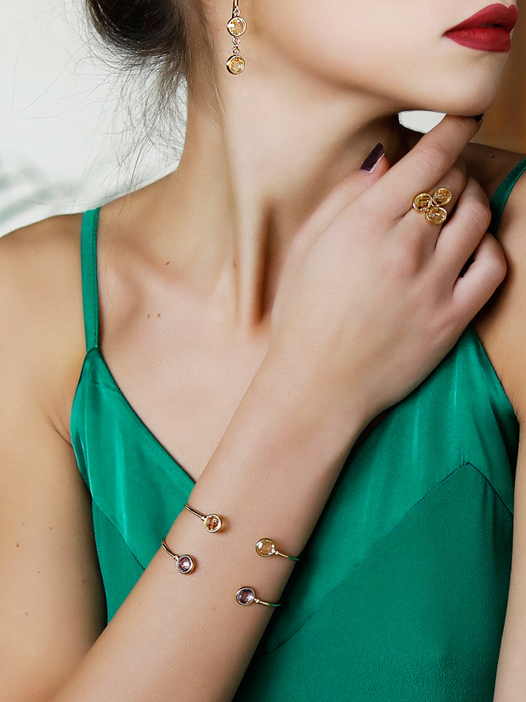 Indulge in the beauty and luxury of our Capri Amethyst Cuff Bracelet, handcrafted in Italy with exquisite 18-karat Yellow Gold Over Silver and two 4.00-carat multifaceted amethyst stones. Inspired by the vibrant landscapes of southern Italy, this piece from the 'Luccichio' collection represents wisdom and is believed to purify the mind. Wear this versatile and elegant cuff bracelet alone or stacked with other pieces from the collection, and elevate any outfit for both daytime and evening occasions. Packaged in our signature Vintouch box, this bracelet is a must-have for any jewelry lover.