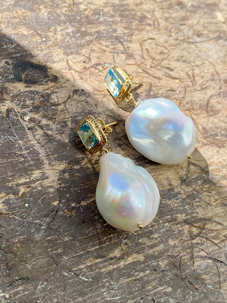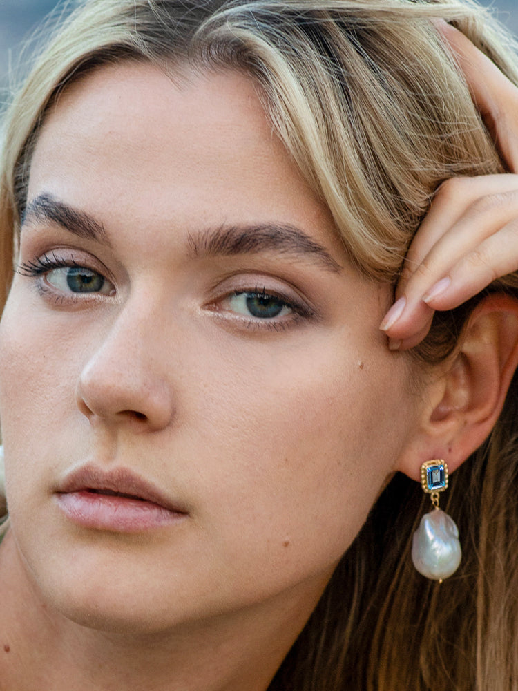 Individually handcrafted in our own studio in Italy, our Luccichio Blue Topaz and Baroque Pearl Earrings are bold and perfect for any special occasion, such as a wedding. Made with genuine blue topaz and baroque pearls, they add a touch of elegance to any outfit.