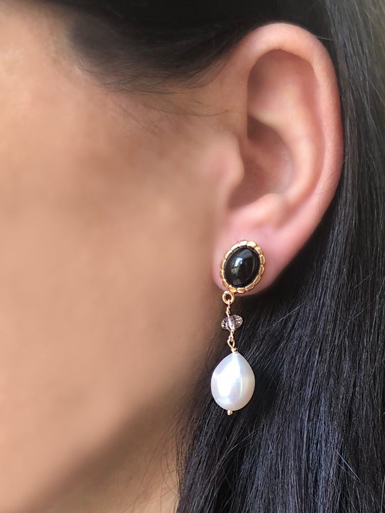 Intended to add a sparkling yet delicate detail to the wearer's outfit, these earrings feature polished black onyx stones strung with natural pink quartz and pearls. They're handmade from 18-karat rose gold-plated silver and they're extremely lightweight so that you can comfortably wear them all day or night long.